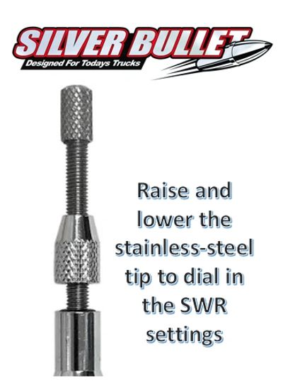 There’s something else that sets the Silver Bullet apart from the rest of the pack. Silver Bullet antennas tune by hand due to the unique knurled tip design, no tools are required. You simply loosen the locking collar and adjust the stainless tip to fine tune for lowest SWR. Once dialed in, snug the locking collar and GO! Everything remains sealed and holds tight thanks to a nitrile rubber O-ring inside. The use of a stainless steel threaded stud at the base rather than machined brass, assures greater strength and longer life too. The end result is more consistent performance, day in and day out. Performance you can count on when you need it most.